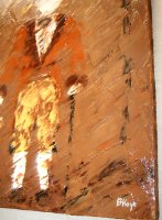 Using warm browns and oranges, she paints portraits of dolls, always leaving the face indistinct. "I want to capture the warm feeling of comfort you get from a doll, but leave the image generic enough so that the viewers can clamin the image for themselves," states Kaye. This faceless quality is typical of her eMotionistic works as well. In all, this series is more abstract from her usual paintings, and quite endearing, too. the warm tones are essential, because without the warmth, the faceless dolls could possibly be a little haunting.